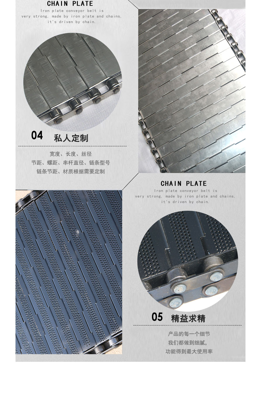 鏈板輸送帶材質:A3低碳鋼,45#鋼,201不銹 鋼,304不銹鋼,316不銹鋼等。