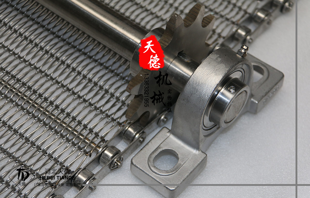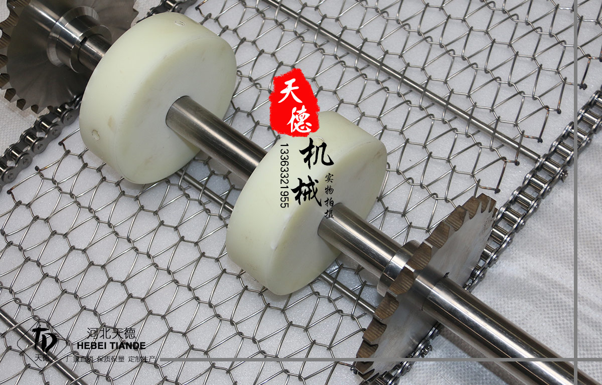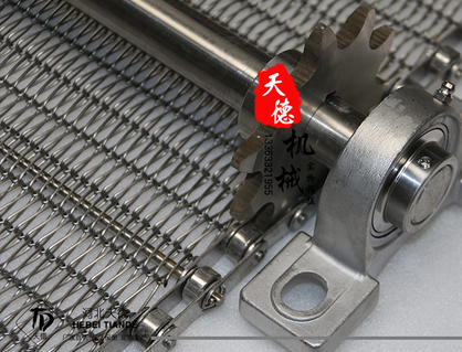 網帶都采用軋牙串條、左右網條二根串,并大小網條連接而成,大網條內穿進小軸,小軸二端穿入鏈條孔,從而達到鏈條驅動輸送網帶。鏈條網傳動平穩、傳動力矩小。