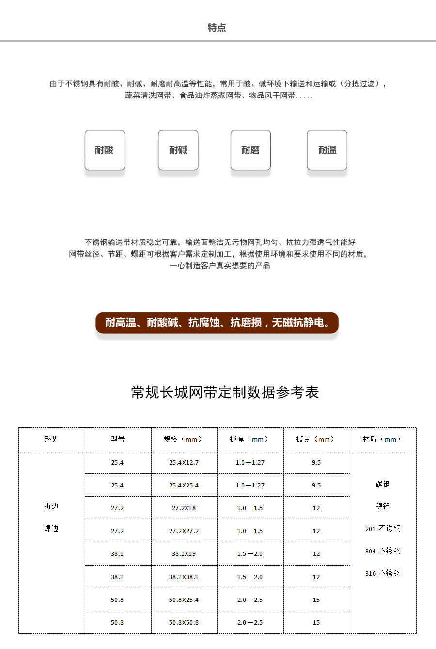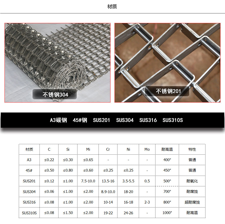 長(zhǎng)城網(wǎng)帶材質(zhì):有A3低碳鋼、45#鋼、1Cr13耐熱鋼、 不銹鋼、304不銹鋼、1Cr18Ni9Ti不銹鋼、0Cr18Ni14NO2CU2耐熱耐酸鋼等